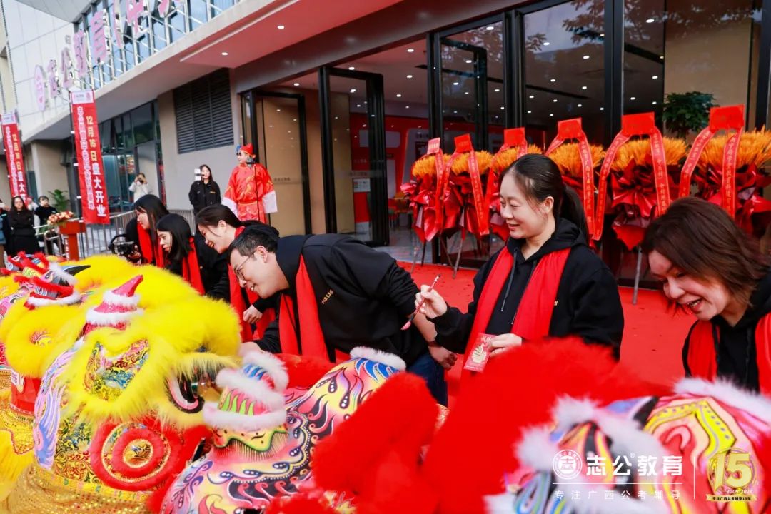 志公教育還專(zhuān)門(mén)請(qǐng)來(lái)了舞獅隊(duì),舞獅點(diǎn)睛是重頭戲,董事長(zhǎng)李勇帶領(lǐng)著公司領(lǐng)導(dǎo)們手持毛筆蘸取朱砂,對(duì)獅頭天庭進(jìn)行點(diǎn)睛。