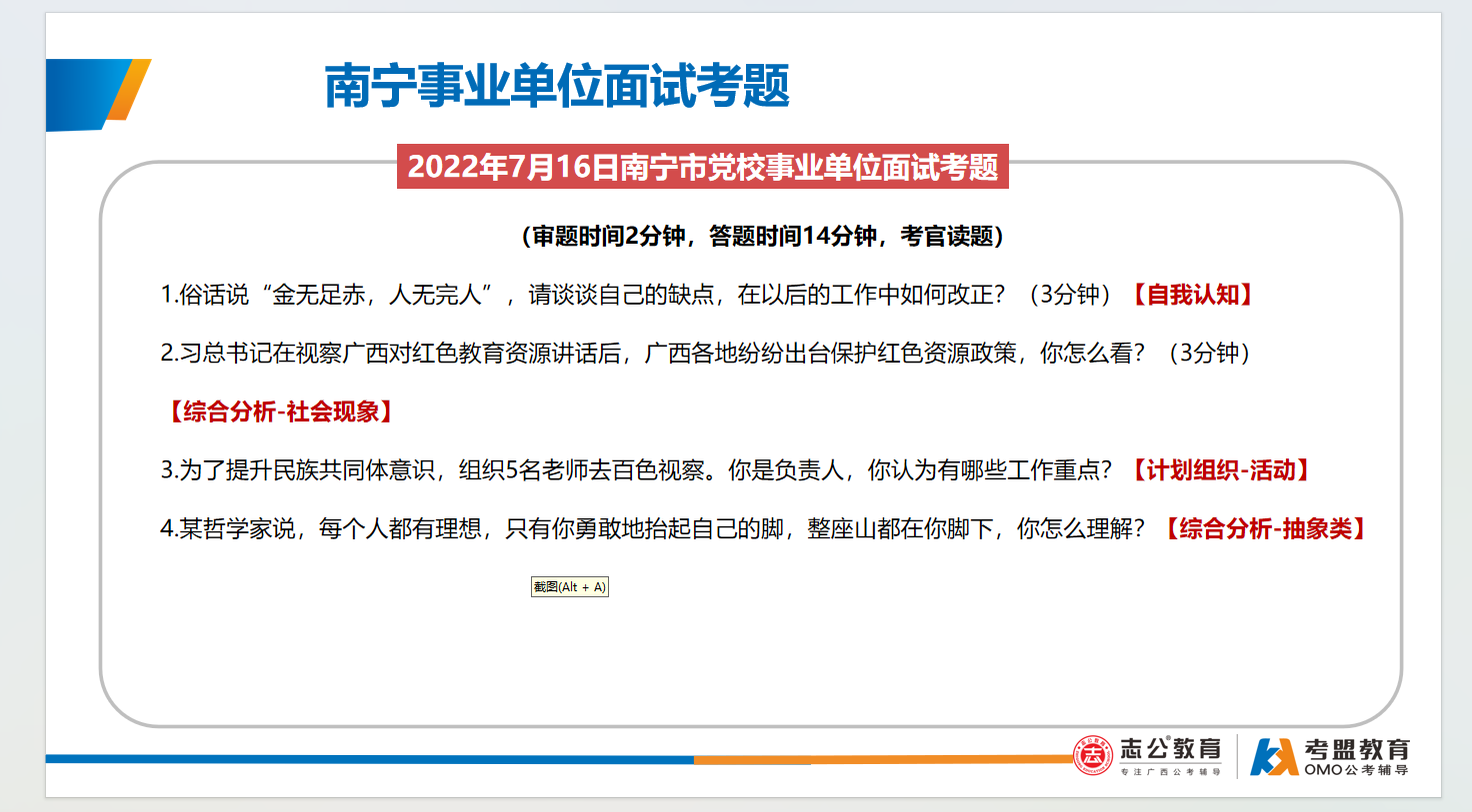 南寧事業(yè)單位面試主要采用結(jié)構(gòu)化面試形式、考查題量有3-4題,答題時(shí)間為9-12分鐘,考查題型:綜合分析(極高)、計(jì)劃組織(極高)、人際溝通(極高)、應(yīng)急應(yīng)變(一般)、貫徹執(zhí)行(一般)、自我認(rèn)知(一般):