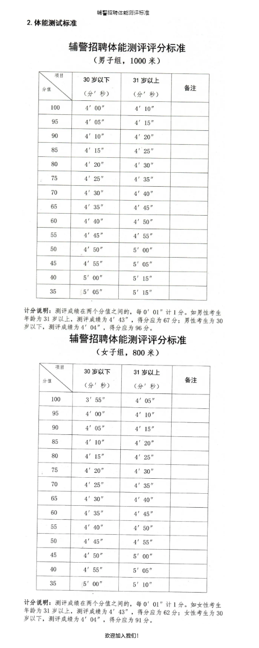 1.測(cè)試項(xiàng)目。長(zhǎng)跑(男子1000米跑,女子800米),體能測(cè)試計(jì)分?jǐn)?shù),滿(mǎn)分為100分,評(píng)分標(biāo)準(zhǔn)附后。