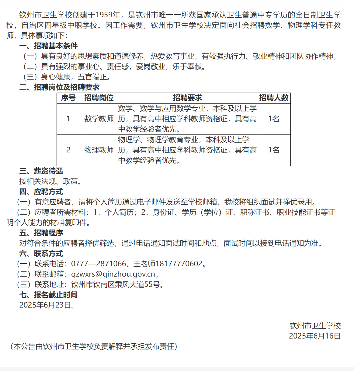 欽州市衛(wèi)生學(xué)校2025年公開招聘數(shù)學(xué)、物理學(xué)科專任教師公告