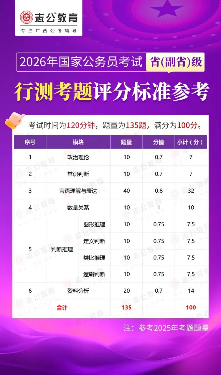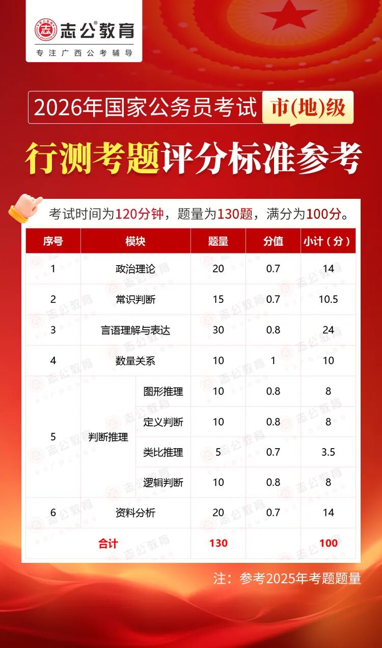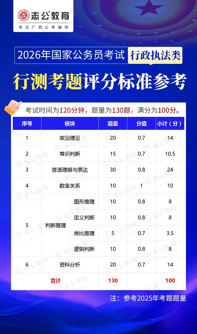 無論報(bào)名人數(shù)是否會(huì)增加,提升自身實(shí)力才是應(yīng)對(duì)2026年國考的關(guān)鍵。行測(cè)作為國考公共科目筆試的核心模塊,不僅分值占比高(通常為 100 分),更是考生之間拉開分差的關(guān)鍵戰(zhàn)場(chǎng)。它并非單純考查知識(shí)儲(chǔ)備,而是通過言語理解、判斷推理、數(shù)量關(guān)系、資料分析、常識(shí)判斷、政治理論六大板塊,綜合評(píng)估考生的信息處理速度、邏輯思維能力、應(yīng)急決策水平等綜合素質(zhì)。