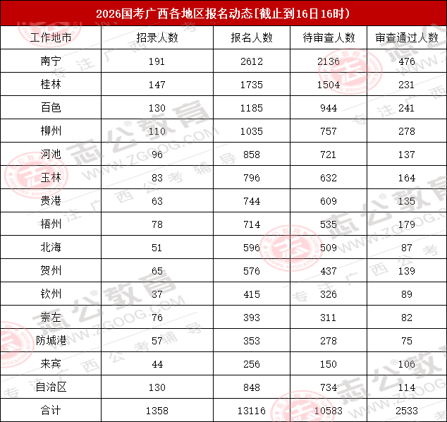 截止到16日16時,2026國考廣西地區(qū)各地市報名人數(shù)最多的地市為南寧、桂林、百色,其中南寧報名人數(shù)為2612人,位居第一!整體報考人數(shù)達13116人!對此,小志建議大家,報考崗位時需將自身職業(yè)愿景與個人實際條件(如專業(yè)、學歷、基層經驗等)緊密結合,理性分析崗位競爭情況,最終做出最適合自己的選擇。
