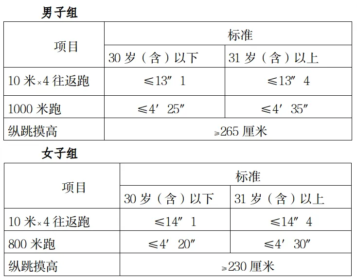 參照《關于印發(fā)<公安機關錄用人民警察體能測評項目和標準>的通知》(公政治〔2024〕60號)執(zhí)行,每個測評項目分別記錄成績。其中縱跳摸高的測評次數不超過3次,10米×4往返跑測評次數不超過2次,男子1000米跑、女子800米跑測評次數均為1次。