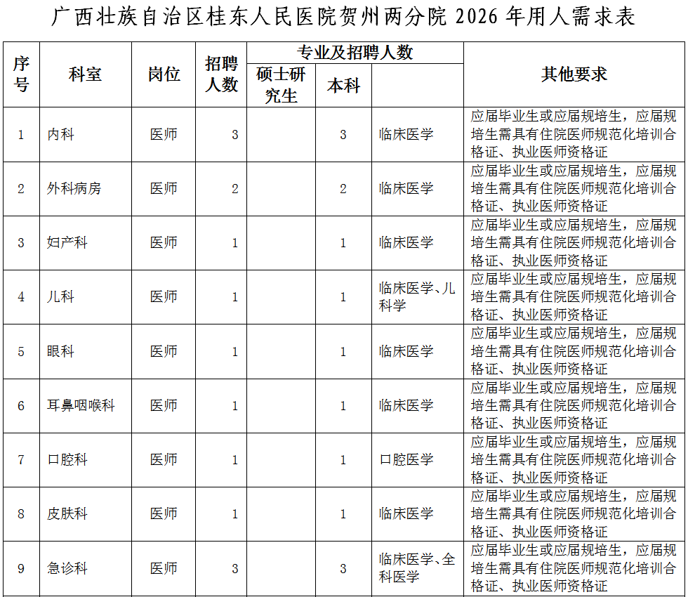 (應(yīng)聘報名二維碼)同時,按以下要求提供個人應(yīng)聘材料(電子版)發(fā)電子郵箱:gdyy2817726@163.com(郵件主題請標(biāo)明:“姓名+賀州兩分院”字樣)。應(yīng)屆畢業(yè)生:個人簡歷、身份證、就業(yè)推薦表、成績單、各種獎項(xiàng)獎勵證書、外語等級證書等。非應(yīng)屆畢業(yè)生:個人簡歷、身份證、畢業(yè)證、畢業(yè)證備案登記表、學(xué)位證、學(xué)位證備案登記表、職稱證、執(zhí)業(yè)證、住院醫(yī)師規(guī)范化培訓(xùn)合格證、工作證明等。報名時所提交的申請材料必須真實(shí)、準(zhǔn)確,因報名時提交的申請材料不真實(shí)、不完整或錯誤填寫報名信息,造成資格審查、面試資格審查不通過的,后果由報名人員自行承擔(dān)。(2)資格審核。人事科依據(jù)招聘公告和用人需求規(guī)定的資格條件對應(yīng)聘人員簡歷進(jìn)行收集和資格初步審查,經(jīng)招聘工作領(lǐng)導(dǎo)小組審核后,確定符合崗位條件報名人員名單,由醫(yī)院人事科電話或短信通知符合條件人員。(3)考核??己斯P試和面試由人事科負(fù)責(zé)組織實(shí)施,協(xié)助部門為醫(yī)務(wù)部、護(hù)理部、科教科以及用人科室,紀(jì)律監(jiān)督部門為監(jiān)察室。逾期未參加則視為自愿放棄。(4)試工。通過考核的非應(yīng)屆畢業(yè)應(yīng)聘人員,須到醫(yī)院試工5天。試工不通過,不予聘用。(5)體檢。體檢工作由廣西壯族自治區(qū)桂東人民醫(yī)院按照有關(guān)規(guī)定統(tǒng)一組織。體檢標(biāo)準(zhǔn)參照《廣西壯族自治區(qū)事業(yè)單位公開招聘人員體檢通用標(biāo)準(zhǔn)(試行)》《廣西壯族自治區(qū)事業(yè)單位公開招聘人員體檢操作手冊(試行)》執(zhí)行。體檢不合格或隱瞞真實(shí)情況致使體檢結(jié)果失真的,不予聘用。因體檢不合格空缺崗位的,將按考核的綜合成績,從高到低,順位補(bǔ)充體檢人員。(6)公示和聘用。對擬聘非應(yīng)屆畢業(yè)應(yīng)聘者在全院范圍內(nèi)進(jìn)行公示,公示期為5個工作日,公示期滿無異議按程序辦理聘用手續(xù)。對公示有異議,經(jīng)核實(shí)影響聘用的,取消其聘用資格;對反映問題難以核實(shí)的暫緩聘用,待核實(shí)清楚后按有關(guān)規(guī)定辦理。