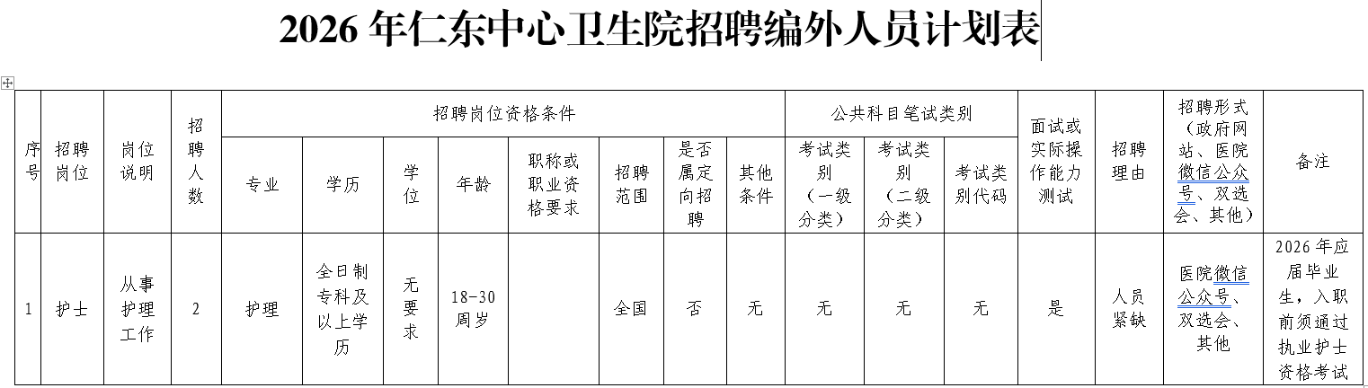 7.學歷、專業(yè)及其他任職要求詳見仁東中心衛(wèi)生院招聘編外人員計劃表。
