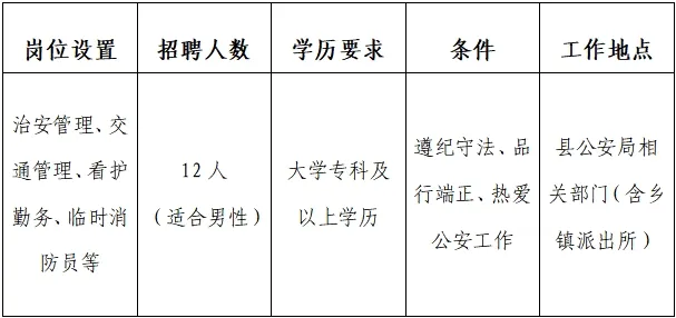 此次招聘的輔警屬勞動(dòng)合同用工性質(zhì),由扶綏縣公安局統(tǒng)一招聘,安排在縣公安局相關(guān)部門(具體職位安排如下)。