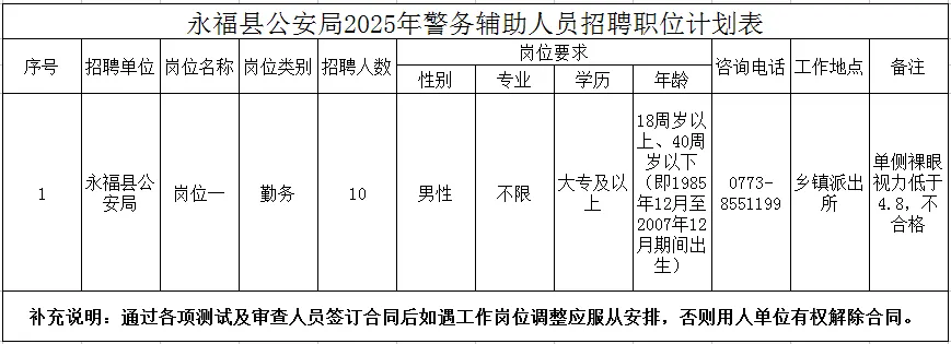 計劃招聘警務(wù)輔助人員10名。具體崗位、招聘人數(shù)、資格條件詳見《永??h公安局輔警招聘計劃表》。